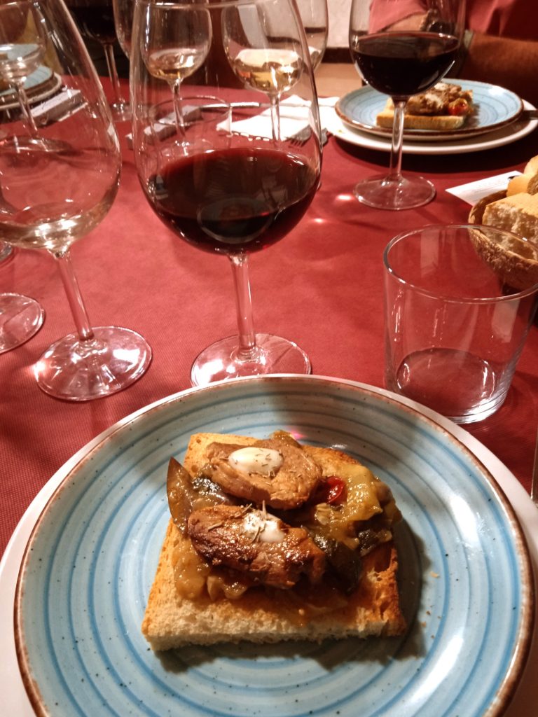 El tercer vino que se probó fue un Tempranillo Ecológico Joven, un tinto muy limpio con un ribete de un color cereza picota con ribetes azulados y de capa alta, que denota su juventud. En nariz despliega aromas a fruta madura con frutos negros del bosque. En boca, fresco y sedoso con buena acidez y persistente en retronasal. Estuvo maridado con tosta de solomillo con verduras y crema de queso al romero.