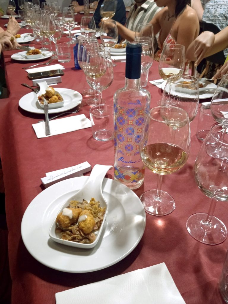 El segundo vino que probamos es buque insignia de la Bodega Juan Pablo II, su Paulus Moscatel Ecológico, tanto en la variedad Moscatel de Alejandría como la de Grano Menudo, un vino espectacular, limpio, brillante con reflejos más dorados, también propios de la variedad, con unos aromas intensos muy florales con notas cítricas como el pomelo, melocotón, piña, etc, quedando demostrado que con la uva Moscatel también se pueden hacer grandes vinos secos, un vino que ha recibido numerosos premios, uno de los más recientes es una Medalla de Oro en los premios Bombo 2024. Este vino estuvo acompañado por unos corazones de alcachofas con setas, jamón y puerro, uno de los platos que el Bullicio tiene en su carta normalmente.