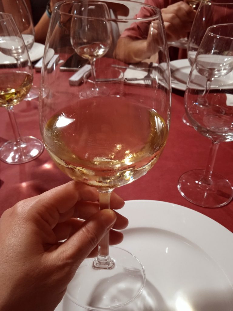 El maridaje comenzó con un Verdejo Ecológico 2023, un vino limpio con reflejos verdosos propios de la variedad, muy aromático e intenso en nariz y boca con una acidez estupenda, estuvo acompañado con una ensalada de rulo de cabra con salsa de aguacate casera.